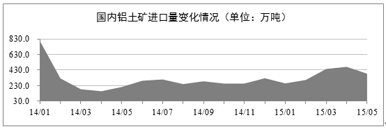 发稿时间:2015-07-20进口铝土矿量下降。2015年5月份的铝土矿进口量依旧保持在较高的水平,但相比前两个月的数据已经出现了较大幅度的下降。海关数据显示,2015年5月份我国的铝土矿进口量为383.2万吨,环比降低了18.80%,同比增长了80.5%。当期,澳大利亚、印度和马来西亚为主要的进口国,其进口占比高达93.4%。